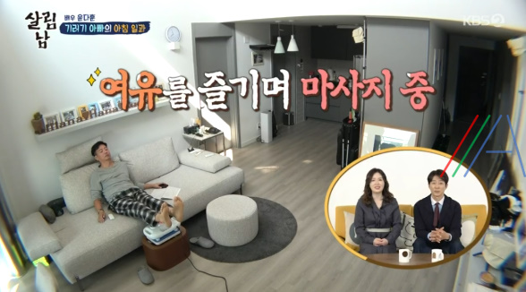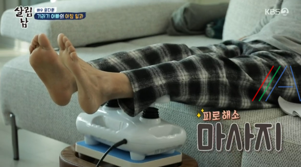 2021년 11월 13일 토요일 밤 9시 15분 <살림하는 남자들2 (살림남)> 방송에서는 배우 윤다훈, 기러기 아빠의 일상이 공개됩니다. 윤다훈의 아침 일상은 영양제를 챙겨 먹고 소파에 앉아 종아리 마사지 기계를 이용해서 피로해소를 합니다.