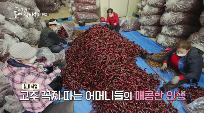 2021년 11월 20일 토요일 저녁 7시 10분 <김영철의 동네 한 바퀴> 방송에서는 무르익다 그 인생 충남 청양 편이 방영 됩니다. 칠갑산 아흔아홉 굽이마다 깊어가는 가을처럼 무르익은 인생사들이 깃어 사는 충남 청양으로 떠납니다. 고추시장 꼭지 따는 어머니들. 김영철이 방문한 청양 하면 단연 고추의 고장답게 전국의 대표적인 마른 고추 전문 시장을 찾아보았습니다.