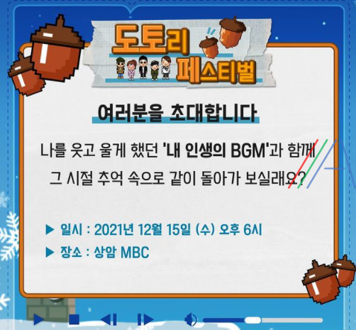 2021년 12월 11일 토요일 저녁 6시 30분에 찾아오는 <놀면 뭐하니?> 방송에서는 도토페 (도토리 페스티벌) 참가할 추억의 가수들을 찾아다니는 모습이 공개되는데요. 도토리 페스티벌 참가 신청 이벤트가 있었는데, 도토페 참가 신청 1만 명 돌파라고 공식 인스타그램을 통해 밝혔네요. 그래서 도토리 페스티벌 정보를 찾아보았어요.