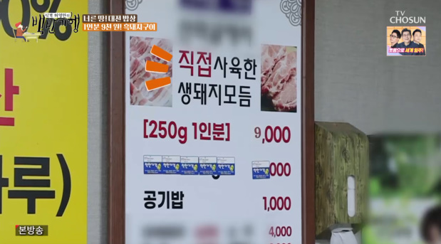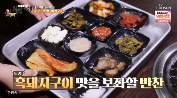 백반기행에서 허영만과 성지루는 대전에서 콩나물밥, 한우육회, 북어찜, 평양냉면, 김치비빔, 두부전골을 맛보았어요. 그 다음으로 간 곳은 직접 사육한 흑돼지고기를 맛볼 수 있는 식당으로 1인분 9천 원이라고 합니다.