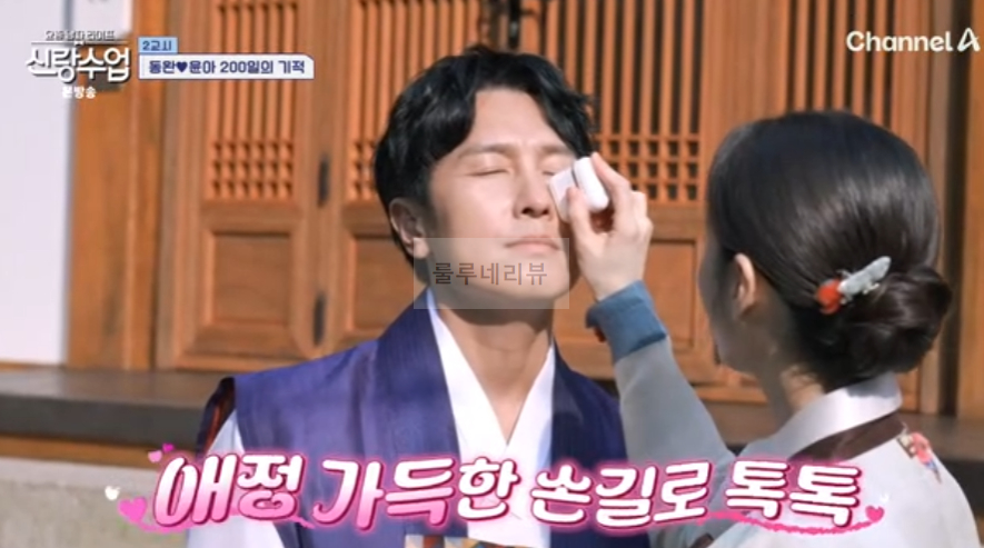 2024년 7월 10일 수요일 밤 9시 30분 신랑수업 방송에서는 2교시 동완과 윤아 커플의 일상이 공개됩니다. 동완와 윤아는 200일의 기적에서 한복을 입고 한옥 마당에서 스냅 사진을 찍었어요. 윤아가 동완의 얼굴에 썬크림을 발라주었어요.